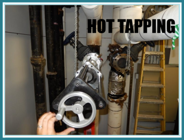 A Hot Tap is the method of cutting a hole in an existing pressurized pipeline to make a new connection without service interruption or product loss. The new connection can be installed to the existing pipe in many different ways. This depends on what type of valve you are using, the pressure of the existing system and the temperature of the existing system. Start by using a Mechanical Saddle or welding your valve fittings to the existing pipe. Install Full Ported Valves, most common are gate valves and ball valves. We recommend installing the shortest distance possible from the valve to the pipe for a shorter stroke when Hot Tap Service is performed. Our machine will connect to the threaded or flanged valve and be pressure tested to ensure all new fittings are sealed before performing Hot Tap Service. When a Hot Tap is performed, the double wired pilot bit retains the coupon and it is recovered when the Hot Tap is completed.